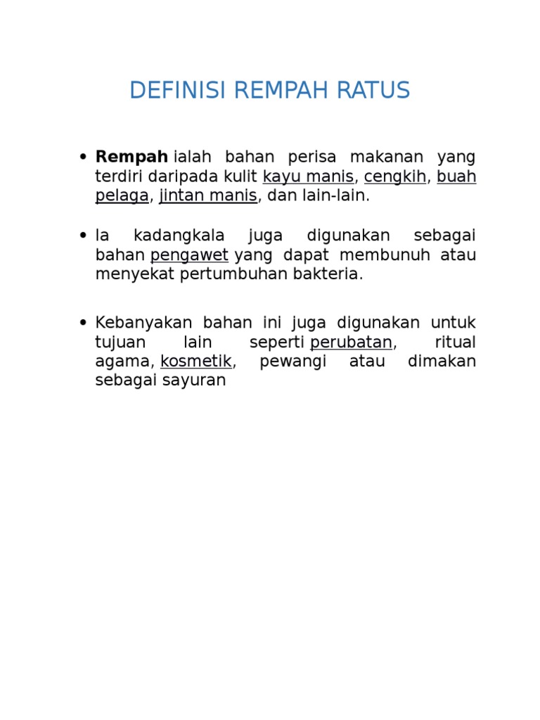 Link to this worksheet. Definisi Rempah Ratus. Buku KEPULAUAN REMPAH-REMPAH telah mencakup pelbagai informasi penting mengenai daerah Maluku Utara selama 700 tahun dan mencakup kurun waktu yang dimulai pada masa awal berdirinya kerajaan-kerajaan lokal yang kemudian dikenal sebagai Kerajaan Moloku Kie Raha 1250 hingga masa lima tahun pasca Proklamasi Kemerdekaan RI 1950.
