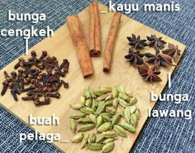 Rempah 4 beradik kayu manis bunga lawang cengkih dan buah pelaga Sos tomatotomato puri 2 sudu besar Daun pandan 1 helai Secubit garam gula dan ajinomoto untuk perasa - ikut selera masing-masing Cara-cara. Rempah ratus 4 beradik kulit kayu manis bunga lawang cengkih buah pelaga Sedikit serbuk ketumbar jintan manis jintan putih Lada hitam ditumbuk halus Daun sup sebagai hiasan Buah tomato - sebagai hiasan sy guna buah tomato yg kecil2 nmpk comel Cara2nya. Apa itu rempah 4 beradik.
